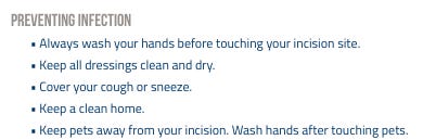 But for many guidelines, there was clear emphasis about pet-related wound infection risk. As an example, the Hughston Clinic reminds patients to wash their hands before touching their incision site (perfectly reasonable), but then reminds them again to wash hands after touching pets. Not after using the bathroom, using their phone (perhaps in the bathroom), shaking hands, etc — the real risk is that pesky pet dander?