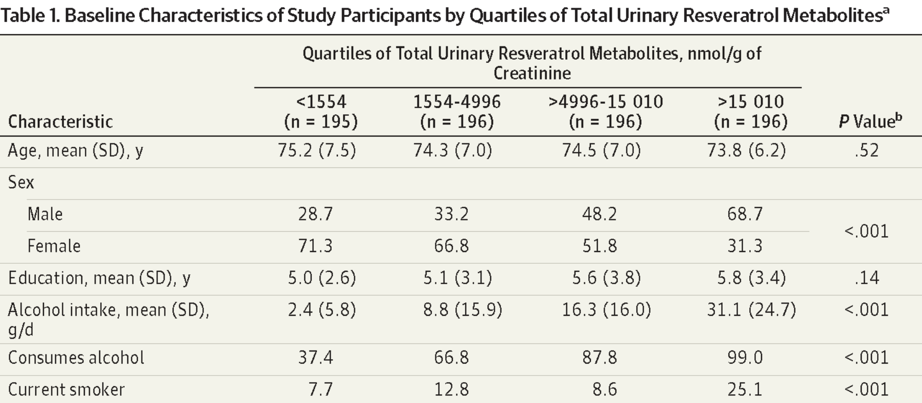 A colleague and I pulled up the full-text paper to read it more closely. At first it looked like a straightforward observational study. The participants were not taking resveratrol supplements, but rather getting their resveratrol from the diet. They didn’t measure resveratrol intake, but rather used the proxy of urinary resveratrol metabolites. They then grouped people by exposure level — in four quartile subgroups, representing those from least resveratrol to most resveratrol. They then examined cardiac risk factors and all-cause mortality… and found resveratrol metabolites weren’t associated with these.