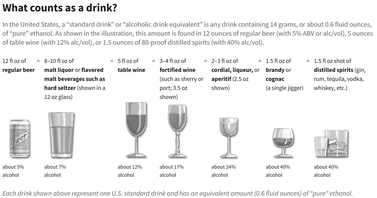 To land in the highest metabolite group (far right), participants had to be consuming a lot of wine. Not “a glass with dinner” levels. Substantially more. Like, the NIH definition of “heavy drinking” As shown below, a drink is considered 14 grams of alcohol. The “high resveratrol” group was getting >2 drinks per day, or 14+ drinks per week.