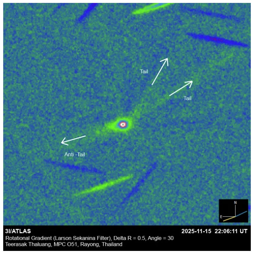 Look at the widely circulated early images of 3I/ATLAS, including this one from November 8 (from M. Jäger, G. Rhemann, E. Prosperi, via ICQ Comet Observations).